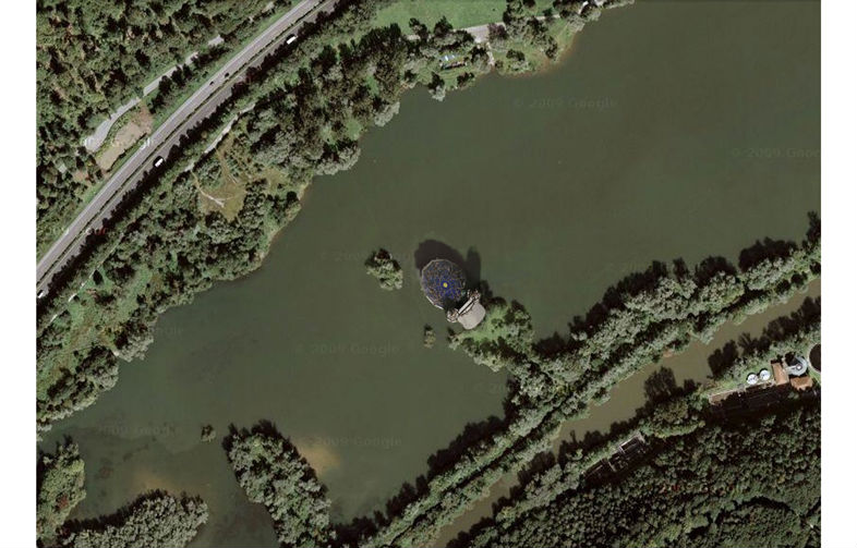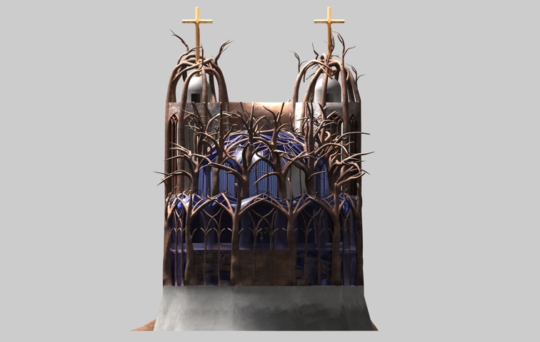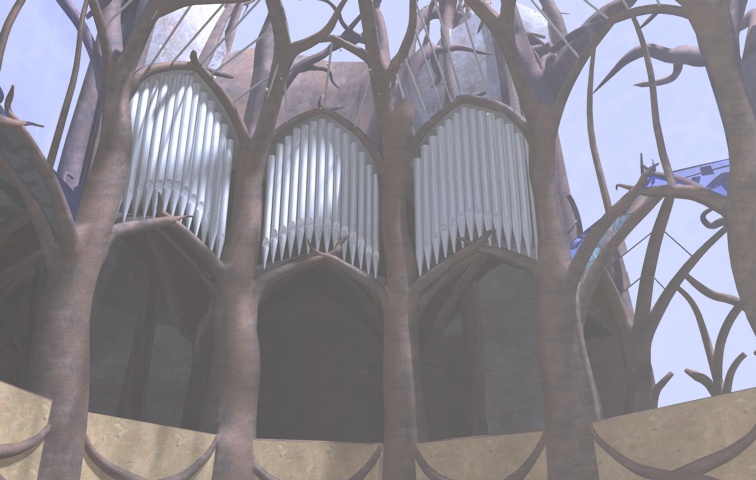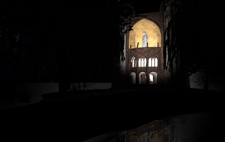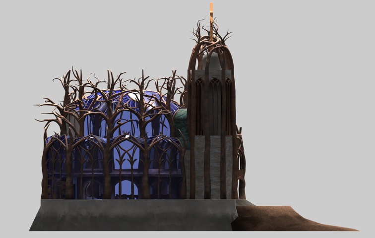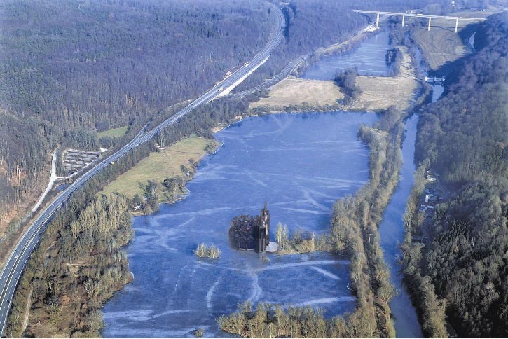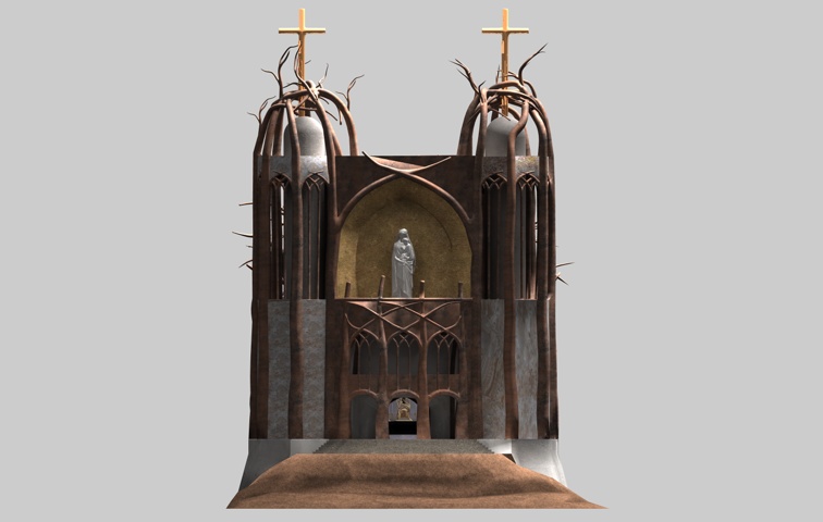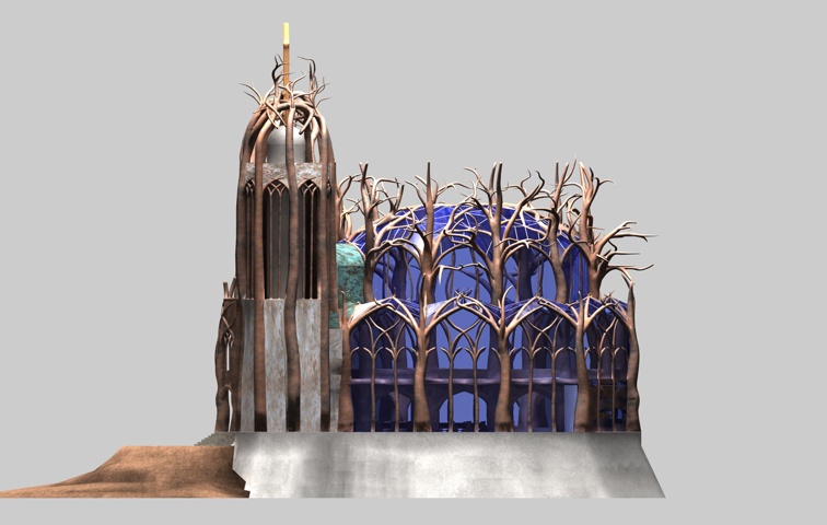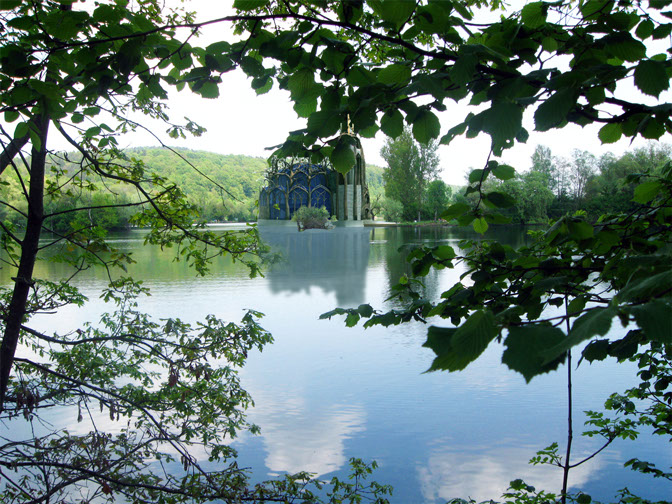 Inmitten des Epplersees, eines ehemaligen Baggersees nahe der Kleinstadt Kirchentellinsfurt erhebt sich dieser Entwurf einer Wallfahrtskirche, deren Formen sich an denen von Bäumen orientieren, die eine in diesem Falle verglaste Lichtung in ihrer Mitte umstehen. Zwar ist die Formensprache weitgehend floral aufgelöst, doch ist die Grundform der Kirche stark von historischen Vorbildern beeinflußt - der Wandaufbau mit Arkade, Empore und Obergaden entspricht weitgehend mittelalterlichen Vorbildern, desgleichen die der Kirche auf ihrer Ostseite vorgelagerte Turmfront.