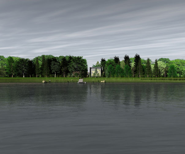 Gemeinsam mit einem Kommilitonen entstand dieser betont modern gehaltene Entwurf einer kleinen Kirche auf der Landesgartenschau in Norderstedt bei Hamburg. Angeregt durch den Pfarrer der der dortigen evangelischen Gemeinde sollte inmitten des Ausstellungsgeländes, nahe einem ehemaligen Baggersee eine Kirche entstehen, deren Hauptmaterialien Glas, Stahl und Beton sein sollten. Diesem Ansinnen wurde hier nachgekommen und es entstand ein reiner Glas-Stahl-Bau, der von wuchtigen Wandscheiben aus rohem Stahlbeton umgeben ist. Zusammen mit dem seeseitig aus dem Beton herausragenden Presbyterium, in dessen Glasfassade ein goldenes Kreuz aus einander überlappenden Metallvorhängen sichtbar ist, entsteht so ein abstrahiertes Bild der Lutherrose.
